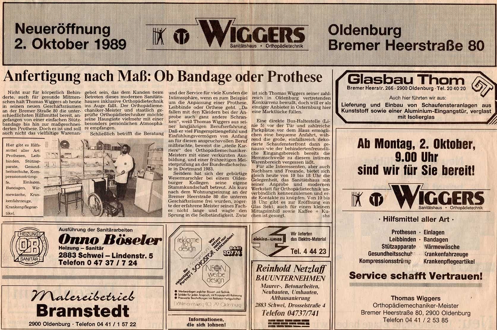 als ich vor 30 Jahren in der Bremer Heerstr. 80 in Oldenburg das Sanitätshaus Wiggers eröffnete hatte, ich das Ziel, eigenständig die bestmögliche Versorgung meiner Kunden zu gewährleisten.Auf 80 m² lief alles zusammen, Laden, Werkstatt, Büro und Anprobe. Unsere Rechnungen wurden auf einer Schreibmaschine geschrieben und Bestellungen per Post an unsere Lieferanten gesendet. In den letzten 30 Jahren hat sich vieles verändert, der technische Fortschritt, die Veränderungen im Gesundheitswesen, die Vorgaben und Erstattungen der Kostenträger. Neue Krankheitsbilder, neue Hilfsmittel und der Anspruch der Kunden stellten mich manchmal vor große Herausforderungen.
